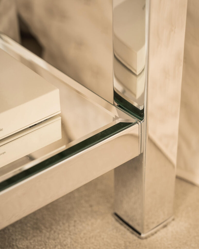 The shelf is also made of chamfered crystal mirror and is mounted 14 cm above the floor. The shelf mounting is solid and stable, also on the chrome frame. The cross reinforcements supporting the shelf are more discreet, and the frame in this section measures 3.5 cm x 3.5 cm. Additionally, the shelf features a simple system that limits its movement and stabilizes it in place, ensuring it does not slide off. The total height of the table is 50 cm and the depth is 35 cm. Each dimension can be adjusted and personalized according to the client’s needs.