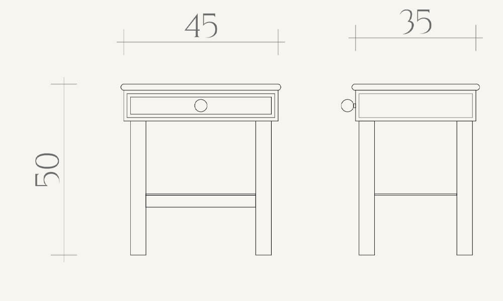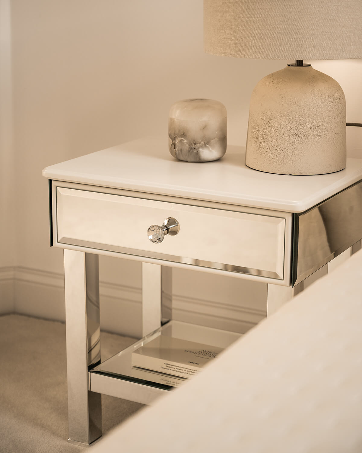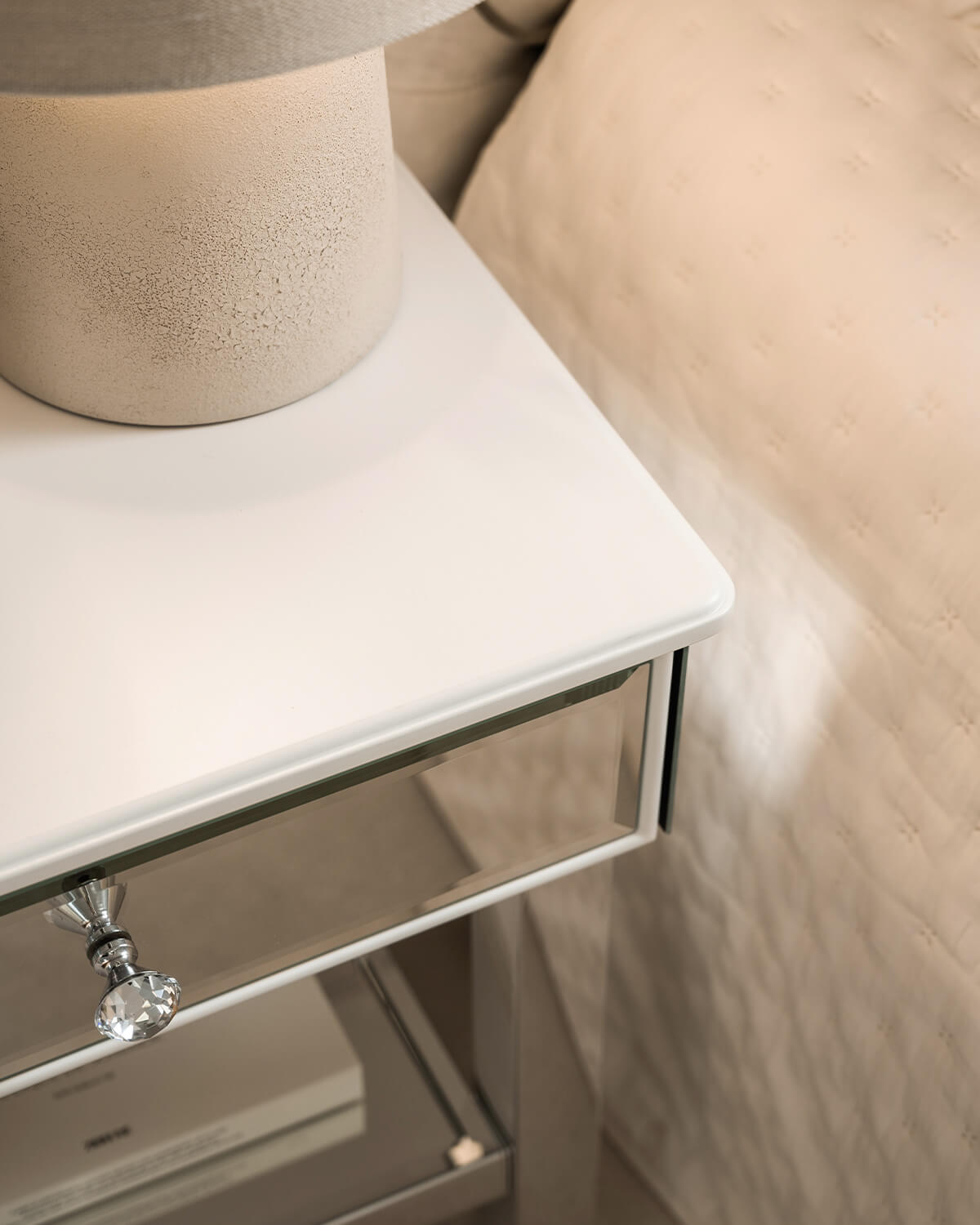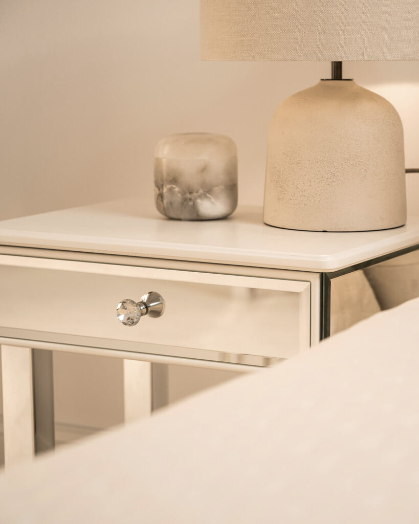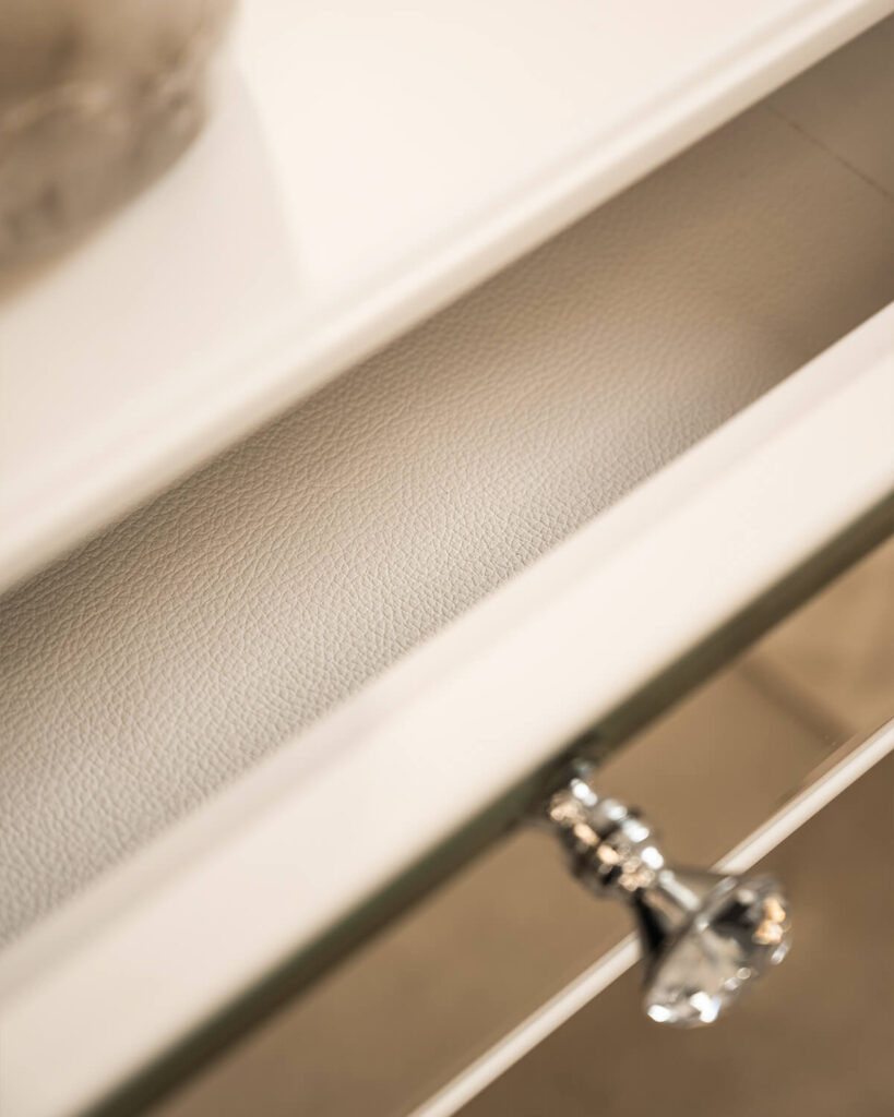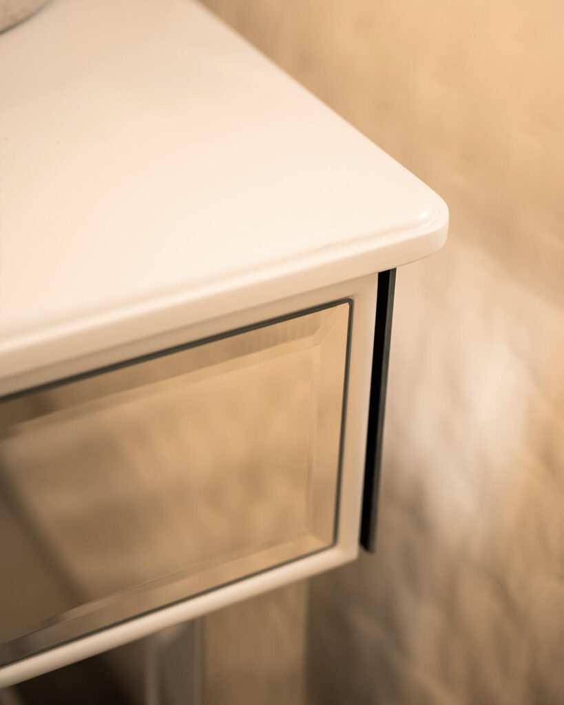 The bedside table has a traditional, simple structure. The sides and back of the table top are finished with chamfered crystal mirror with a height of 10 cm. The top surface is finished with satin MDF in a warm white color, and the edge features a subtle groove that additionally decorates the piece. The MDF elements used in this design have been perfected by our workshop and are made of the highest quality materials, and the color can be changed upon request according to the RAL or NCS color palette.