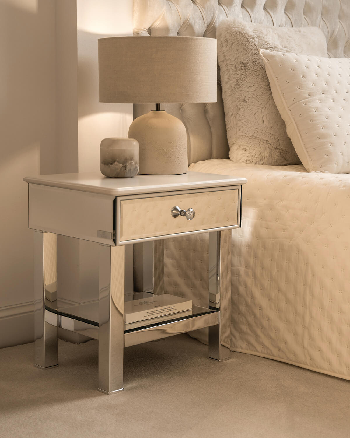 Mirror bedside cabinet with MDF top and chamfered, mirror drawer front in an MDF frame Brooklyn Silk II Brooklyn Collection