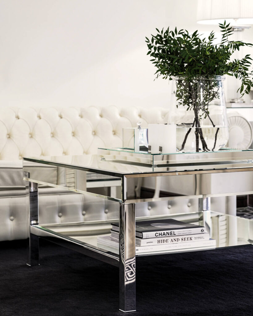 The table top is made of a precisely polished crystal mirror, chamfered on 2 cm, where its thickness is 10 cm. The sides of the table top are also chamfered – on 1 cm. The whole thing is standing on a subtle chromed frame, with the square profile 4.5 cm x 4.5 cm, which is resistant to the passage of time. The inspiration for the frame was a traditional furniture of everyday use.