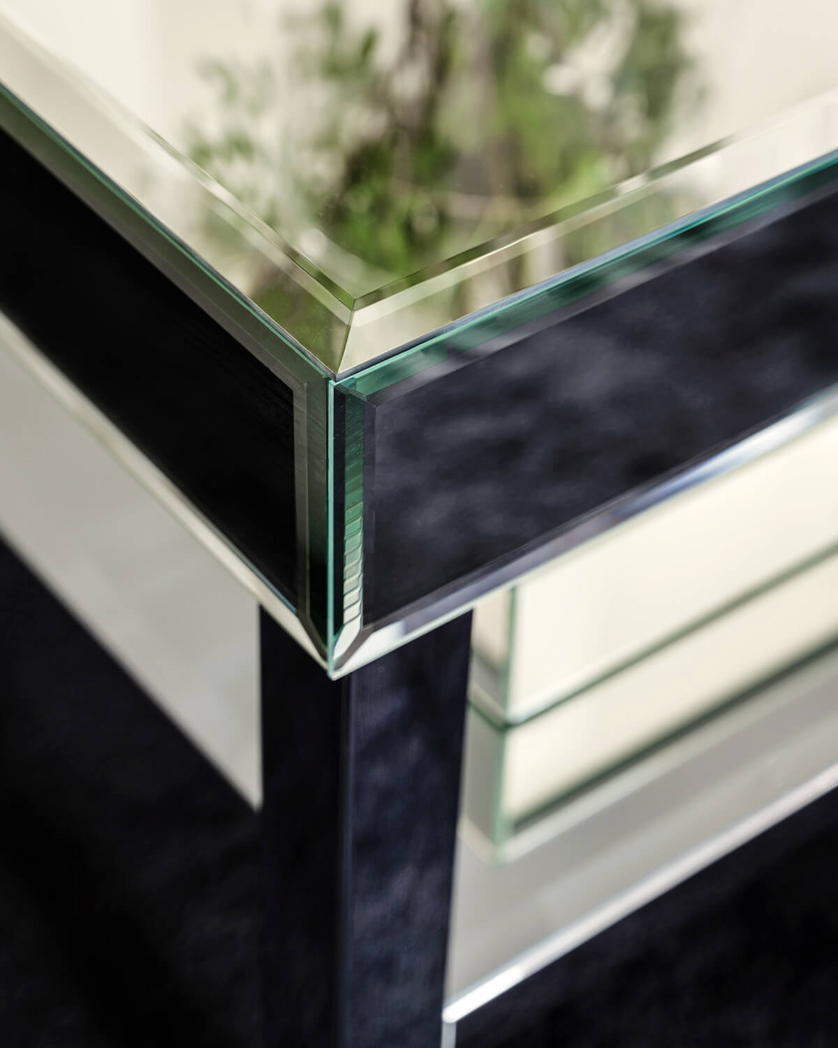 The Brooklyn Collection features a harmonious, simple, and minimalist construction on a chrome frame. Its modern look stems from the absence of ornamentation—only a crystal knob on the drawers nostalgically references the tradition of cut glass, while the mirrored surfaces add a touch of glamour. The tabletop is solid and minimalist, resting on a sleek chrome base. The collection’s greatest advantage is its versatility.
