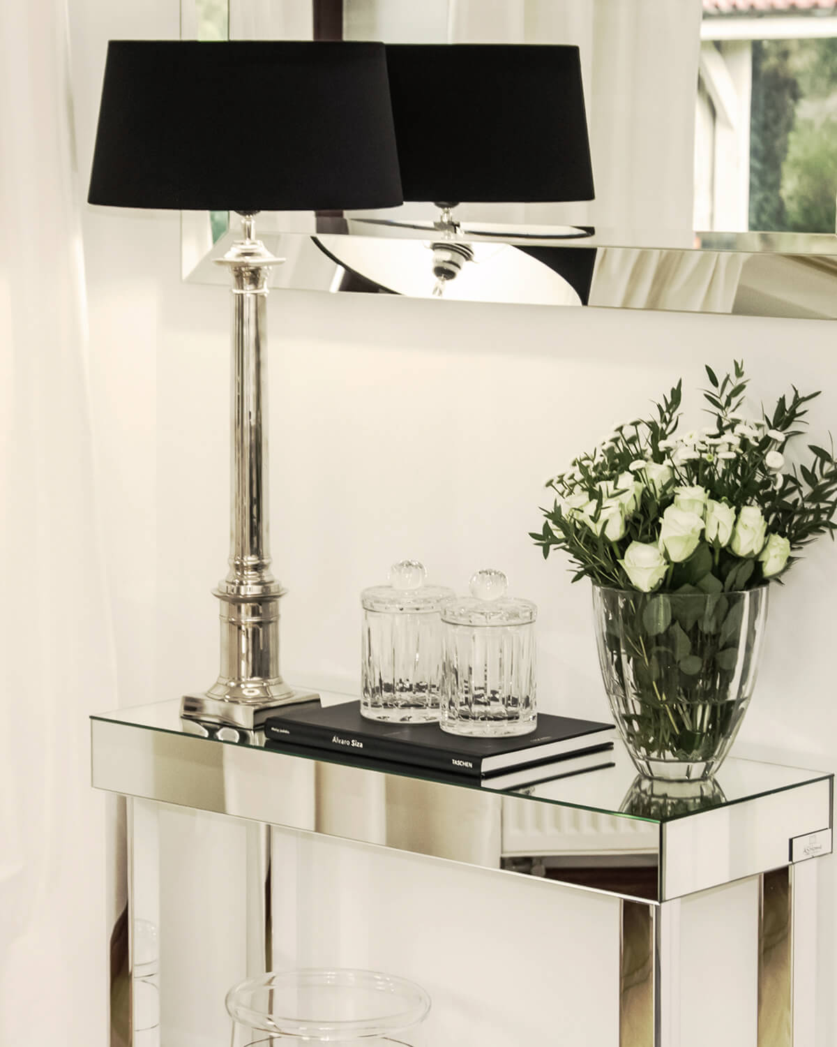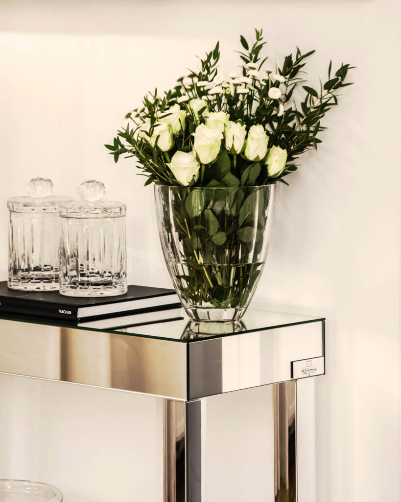 The Brooklyn Collection features a harmonious, simple, and minimalist construction on a chrome frame. Its modern look stems from the absence of ornamentation—only a crystal knob on the drawers nostalgically references the tradition of cut glass, while the mirrored surfaces add a touch of glamour. The tabletop is solid and minimalist, resting on a sleek chrome base. The collection’s greatest advantage is its versatility.
