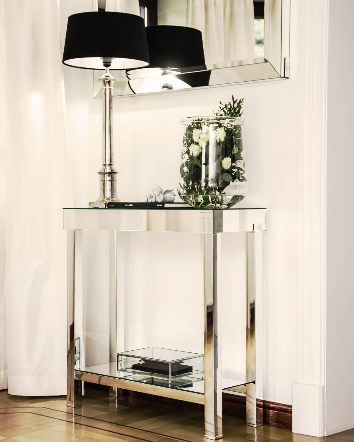 The top of the console is made of precisely polished crystal mirror. The whole thing is seated on a subtle and exclusive chrome frame with a square profile(dimensions 4,5 cm x 4,5 cm). The shelf is placed 14 cm above the floor and it stands on a little thiner reinforcements frame (dimensions 3,5 cm x 3,5 cm). It also has a simple system that doesn’t let the shelf move too much.