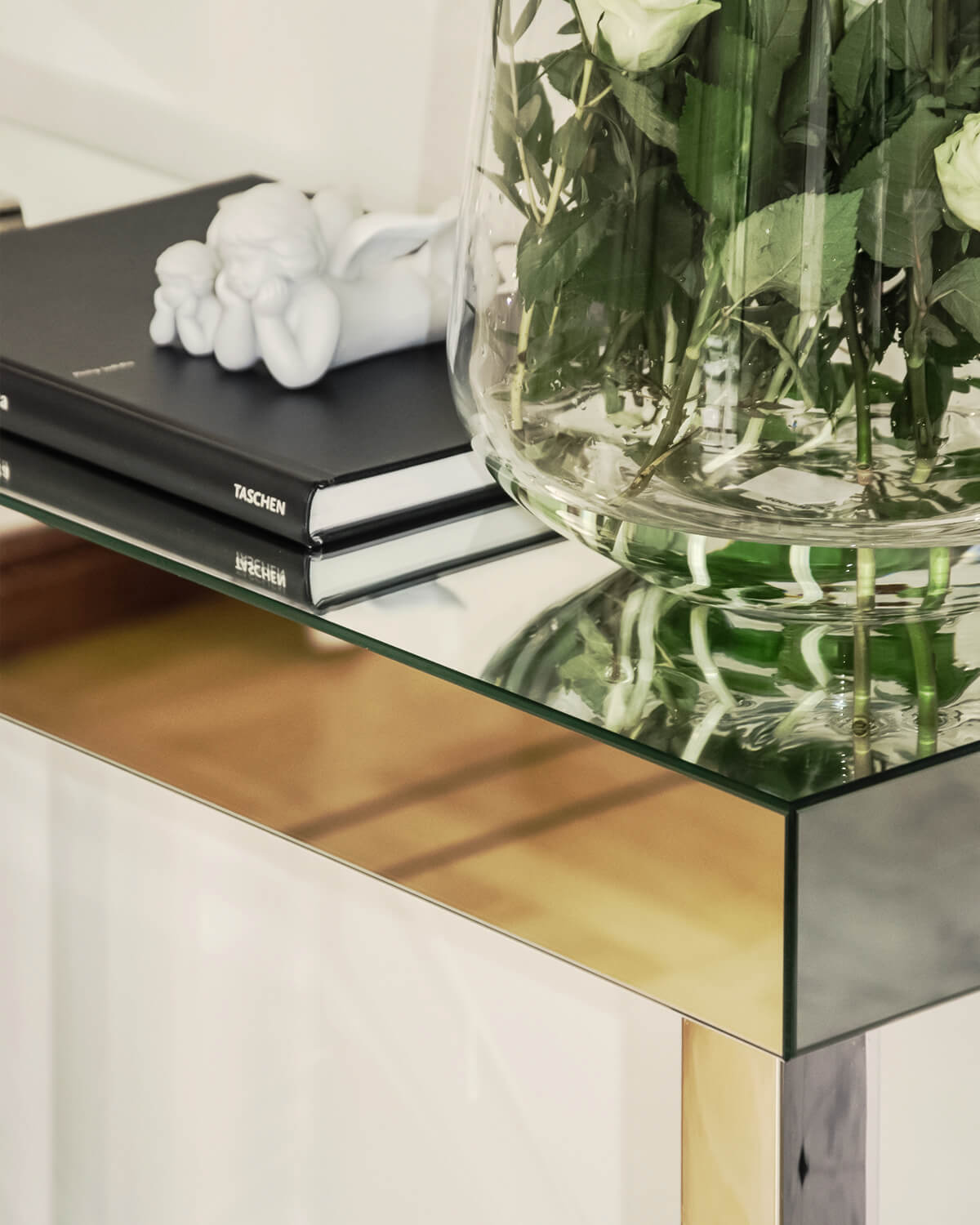 Mirror console project has been made with precision same as searching for the best materials and the final handmade realization. It looks a little different than the original mirror console BROOKLYN. We have created various modifications of this furniture so that every customer can find the most matching type for their interiors. It is an elegant, shiny and exclusive furniture.