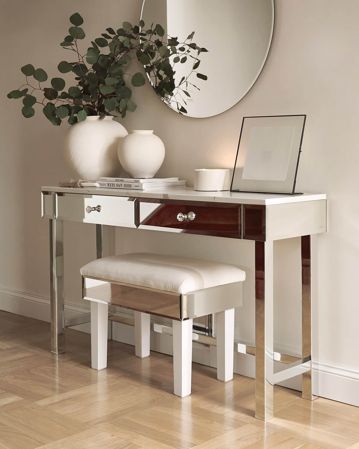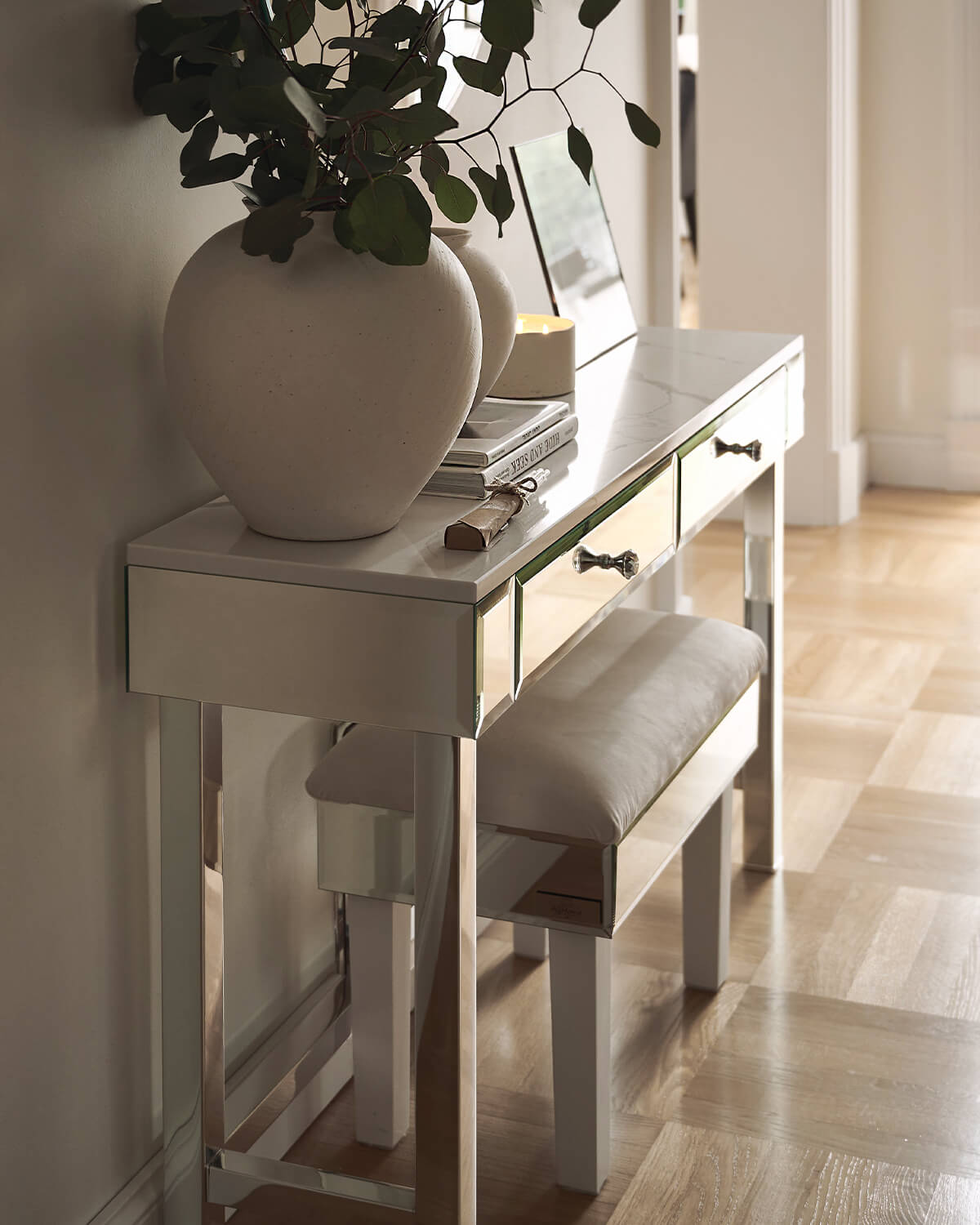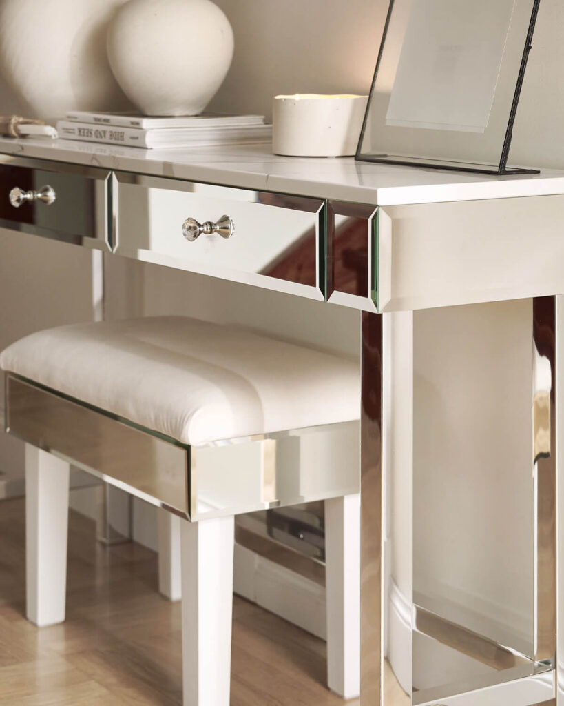 The Brooklyn Collection features a harmonious, simple, and minimalist construction on a chrome frame. Its modern look stems from the absence of ornamentation—only a crystal knob on the drawers nostalgically references the tradition of cut glass, while the mirrored surfaces add a touch of glamour. The tabletop is solid and minimalist, resting on a sleek chrome base. The collection’s greatest advantage is its versatility.