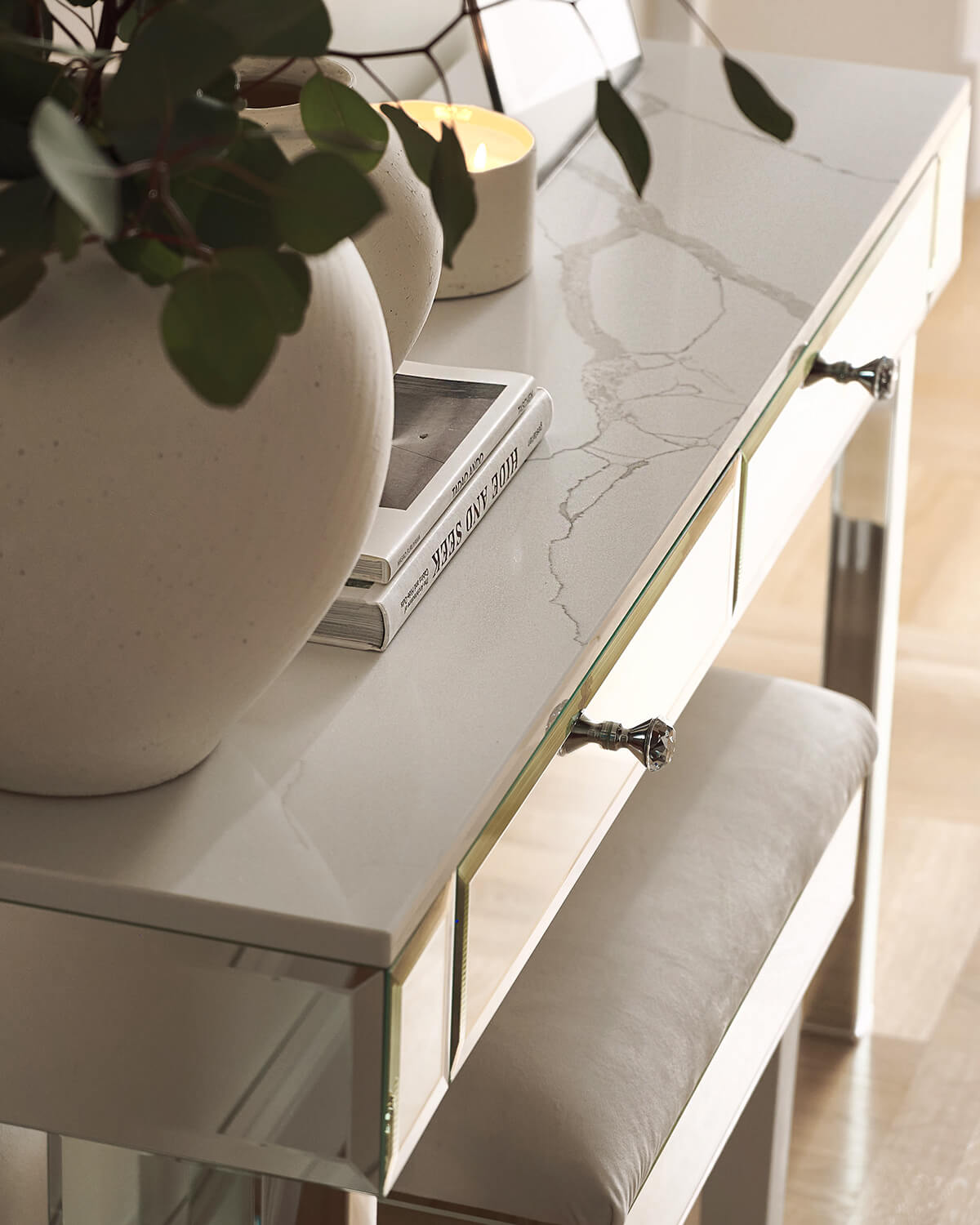 Mirror console with drawers BROOKLYN MARBLE has been made with precision from projecting, through searching for the best materials and the final handmade realization. We made some changes in the standard version of BROOKLYN console: added the quartz conglomerate CALACATTA SILVA to the table top and designed the table top with drawers finished with chamfered crystal mirror, so that we created a sublime, everyday use furniture, not only underlining the character of the interior but also fulfilling a utility function. It’s a shiny, tempting by its elegance and luxurious look, element of the interior equipment.
