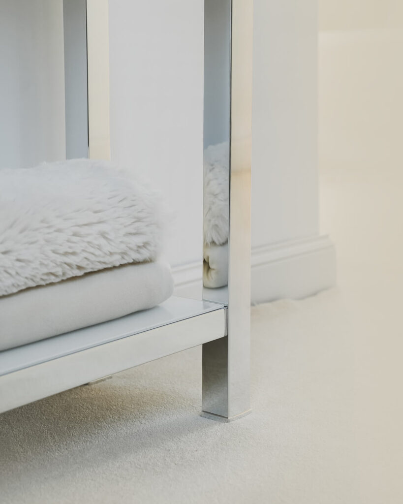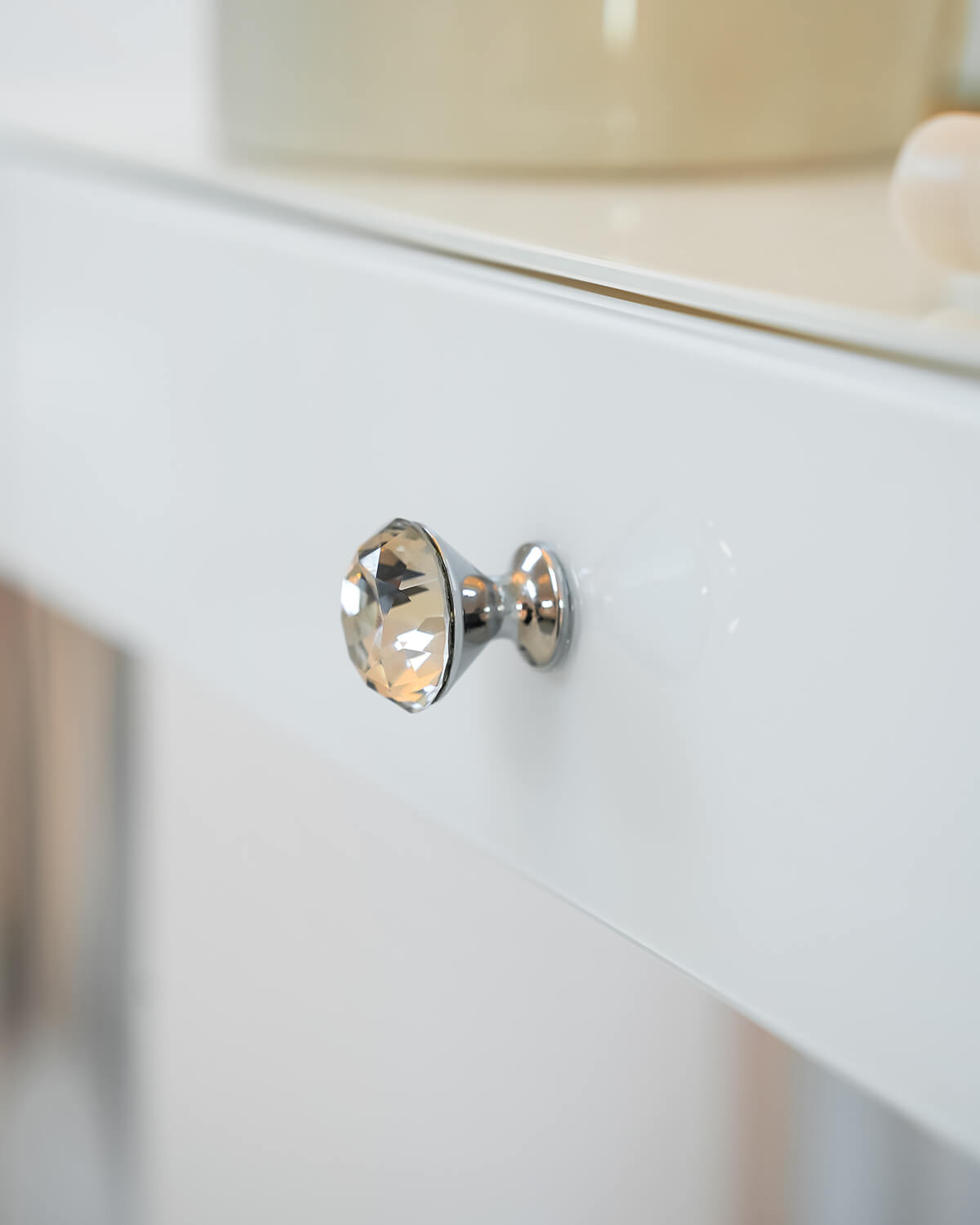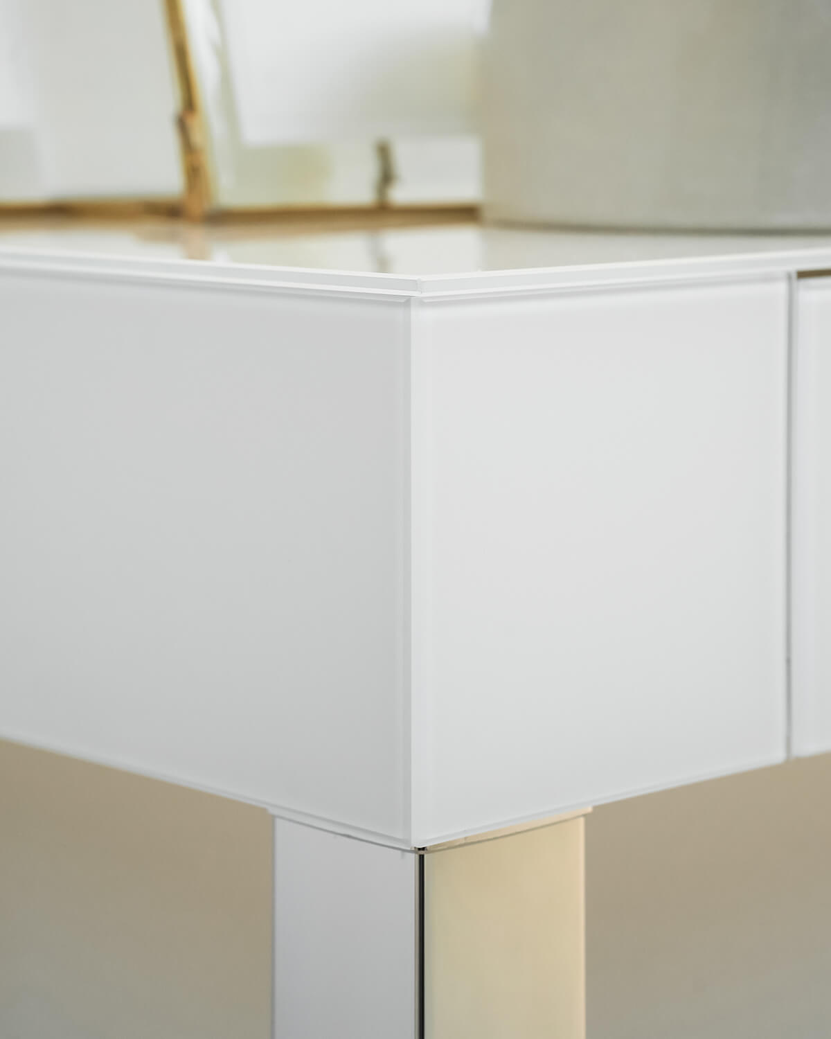 The Brooklyn Collection features a harmonious, simple, and minimalist construction on a chrome frame. Its modern look stems from the absence of ornamentation—only a crystal knob on the drawers nostalgically references the tradition of cut glass, while the mirrored surfaces add a touch of glamour. The tabletop is solid and minimalist, resting on a sleek chrome base. The collection’s greatest advantage is its versatility.