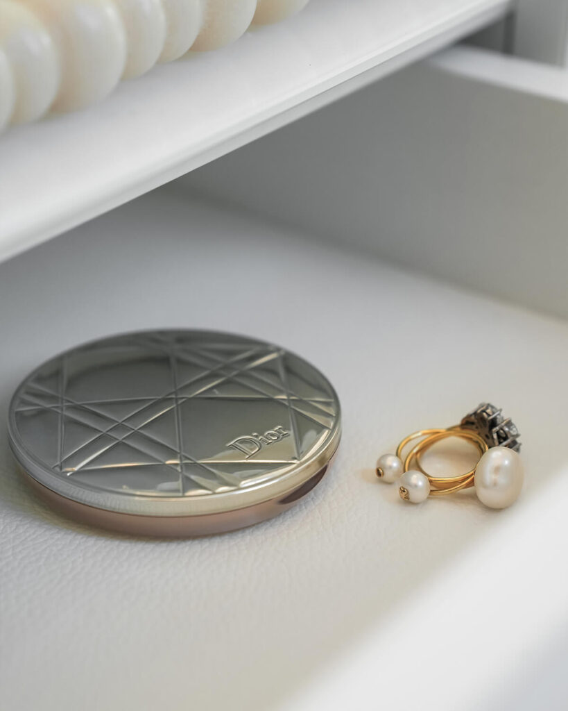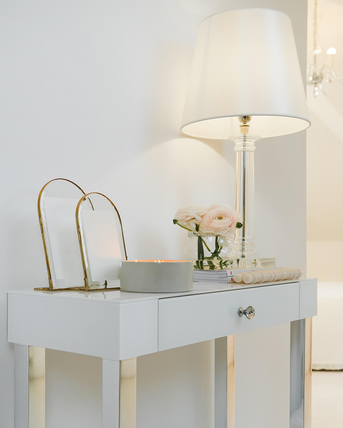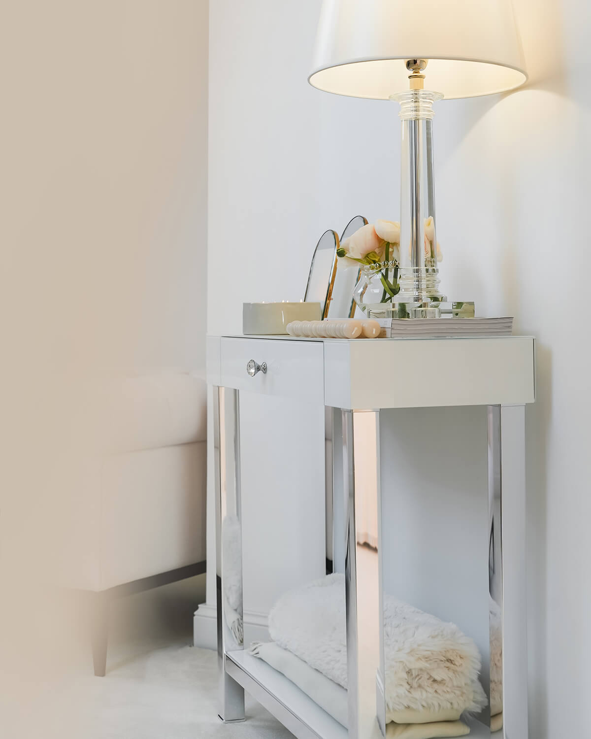 The Brooklyn Collection features a harmonious, simple, and minimalist construction on a chrome frame. Its modern look stems from the absence of ornamentation—only a crystal knob on the drawers nostalgically references the tradition of cut glass, while the mirrored surfaces add a touch of glamour. The tabletop is solid and minimalist, resting on a sleek chrome base. The collection’s greatest advantage is its versatility.