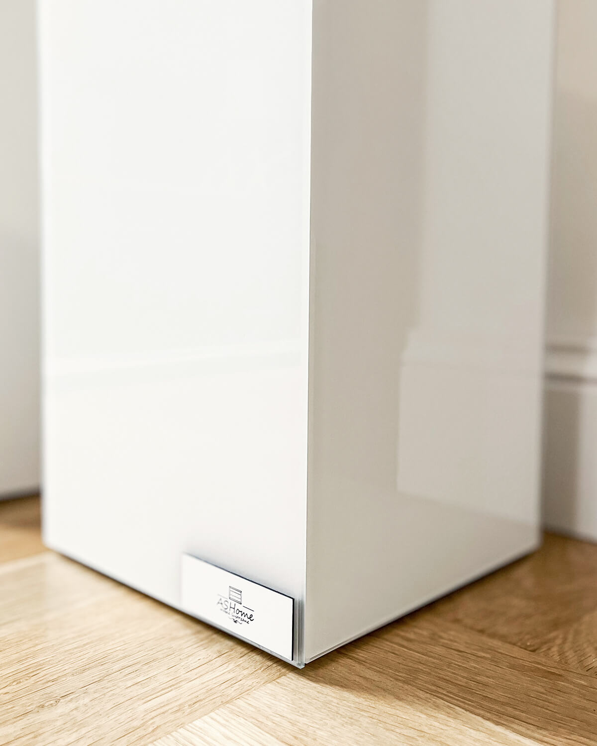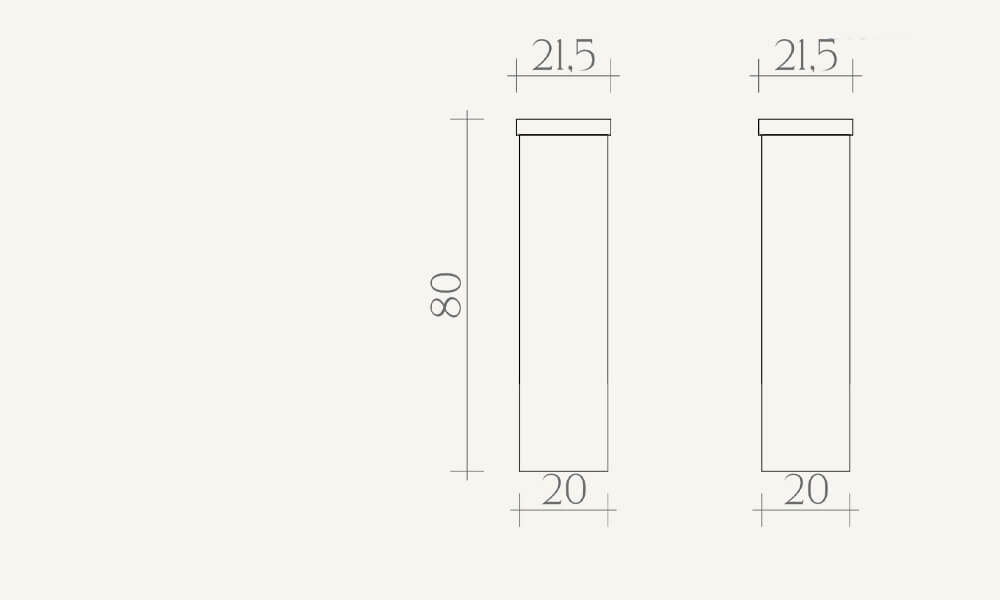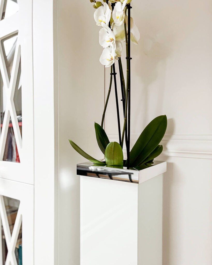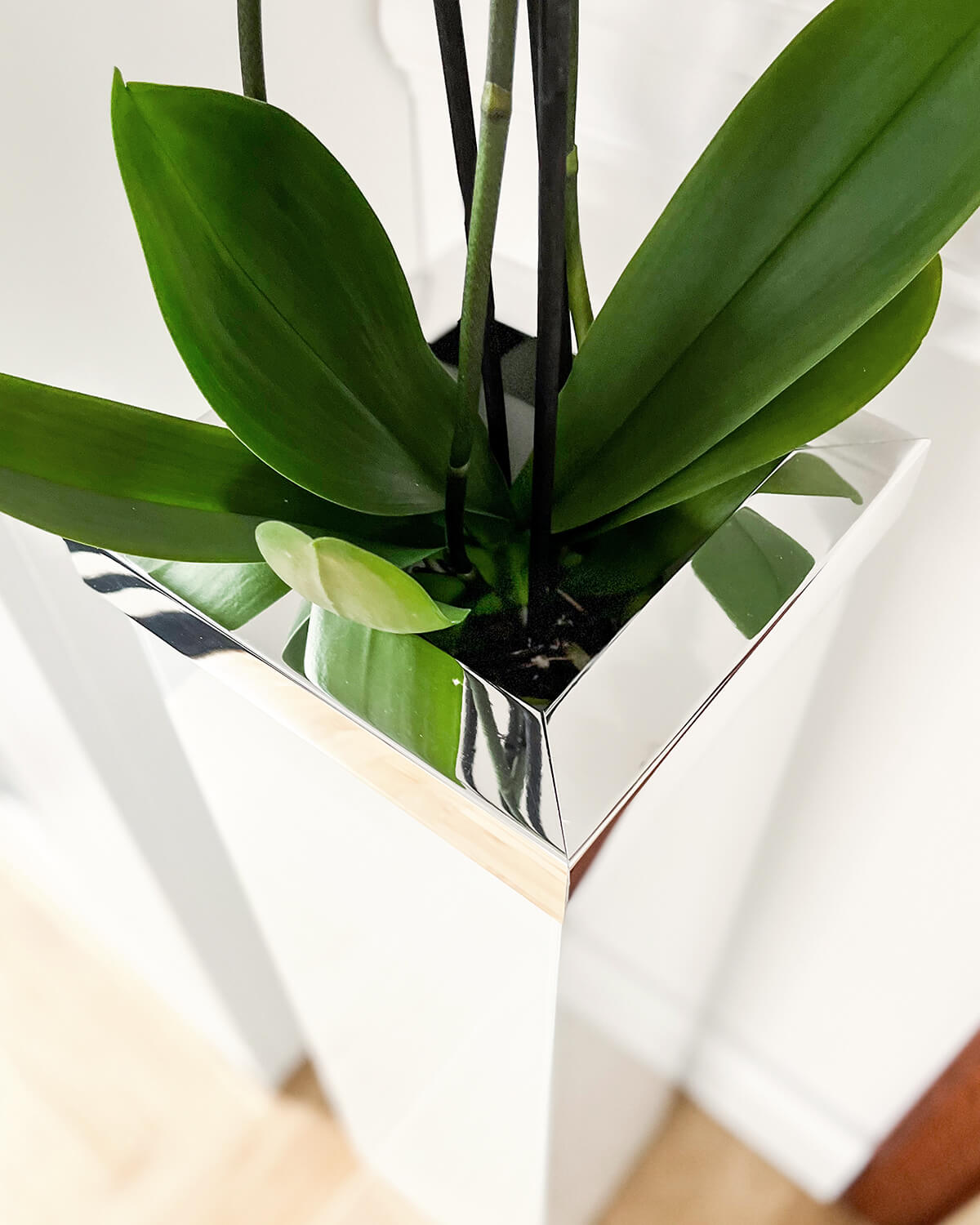 Cała konstrukcja donicy wykończona została białym lacobelem, a jej wymiary zewnętrzne u podstawy to 20 cm szerokości, 20 cm głębokości i 80 cm wysokości. Profil stelażu pokrytego chromem jest widocznym zakończeniem donicy i pozostanie w standardowych wymiarach 3,5 cm x 3,5 cm, łączony na krawędziach pod kątem 45˚.