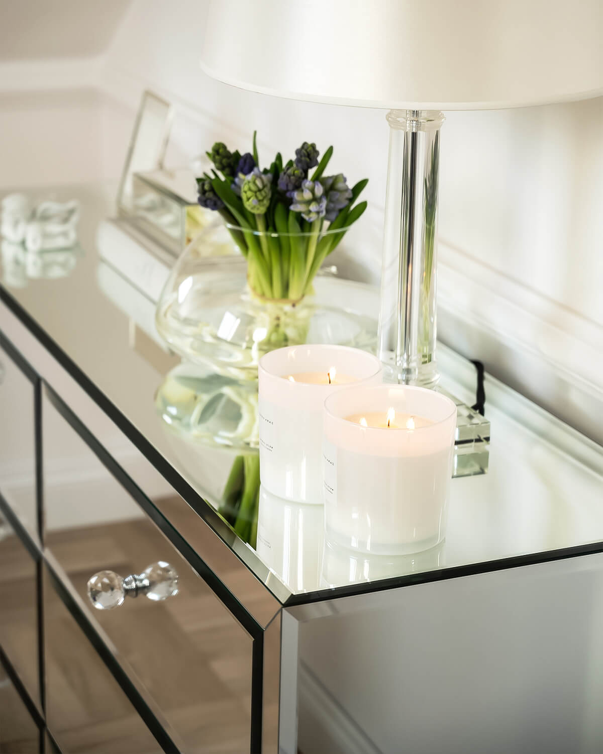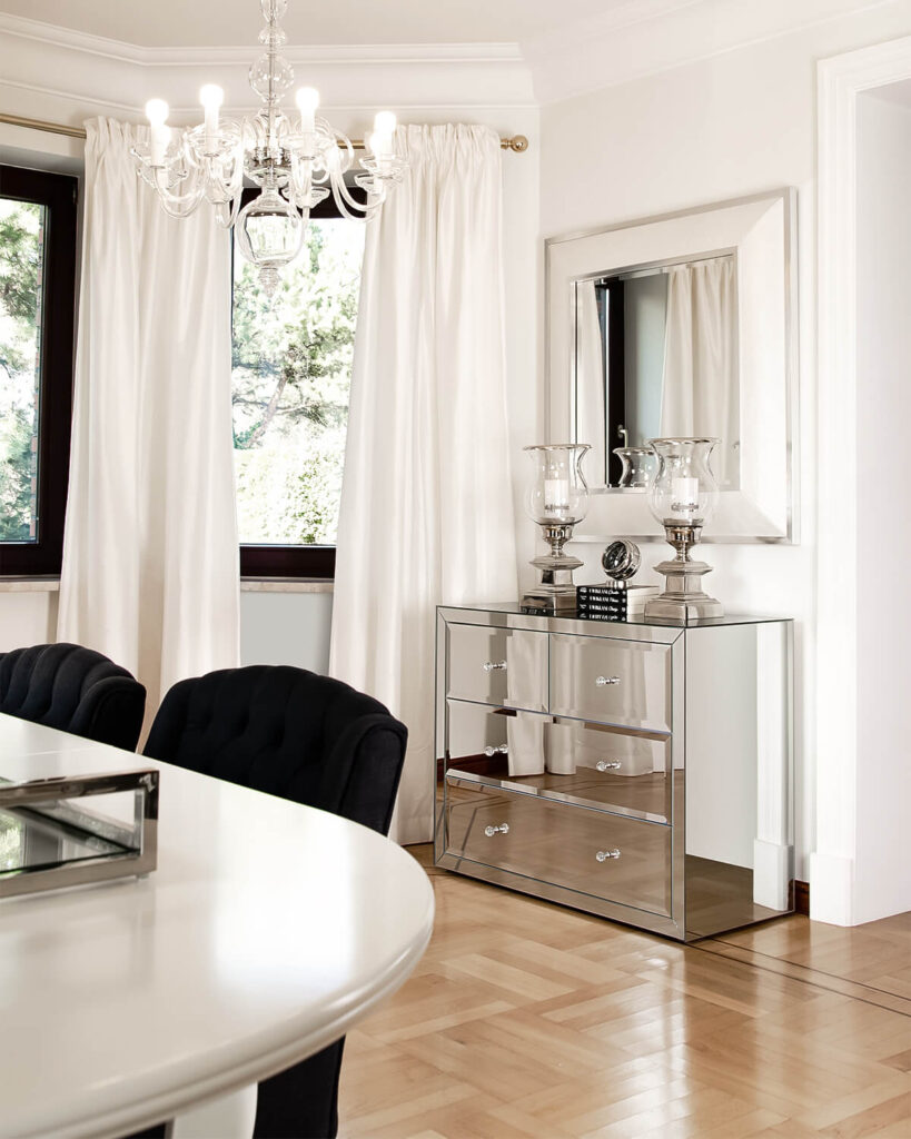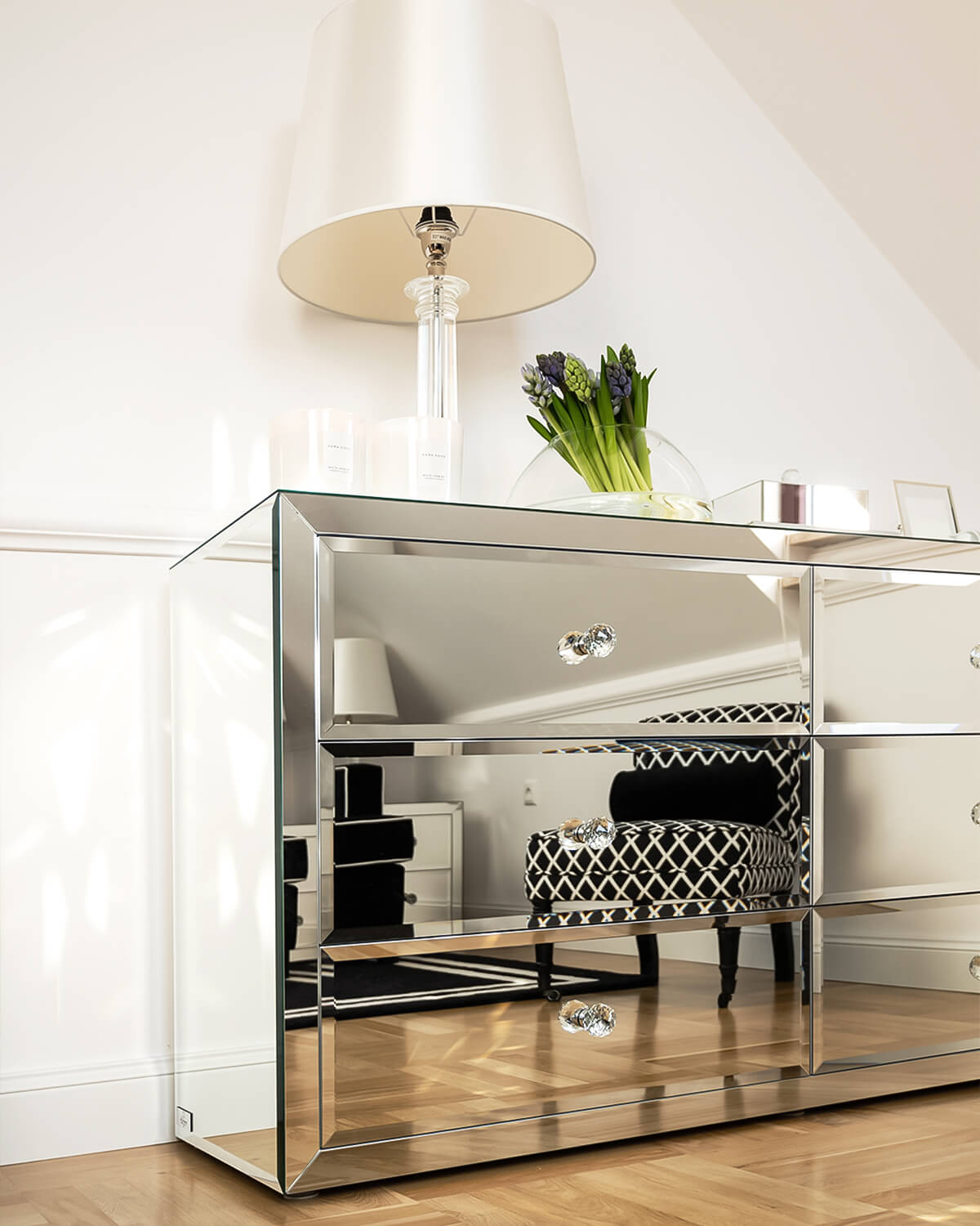 Komoda z lustra kryształowego z kolekcji Greenwich o prostej, starannie wykonanej, pełnej formie, z licznymi fazowaniami na szufladach i ozdobiona jedynie gałkami kryształowymi w formie uchwytów, rozbudowała ofertę firmy AS Home o dział mebli przeznaczonych do przechowywania. Projekt mebli z kolekcji Greenwich tworzy meble użytkowe, które mimo swojej funkcjonalności nie tracą walorów estetycznych.