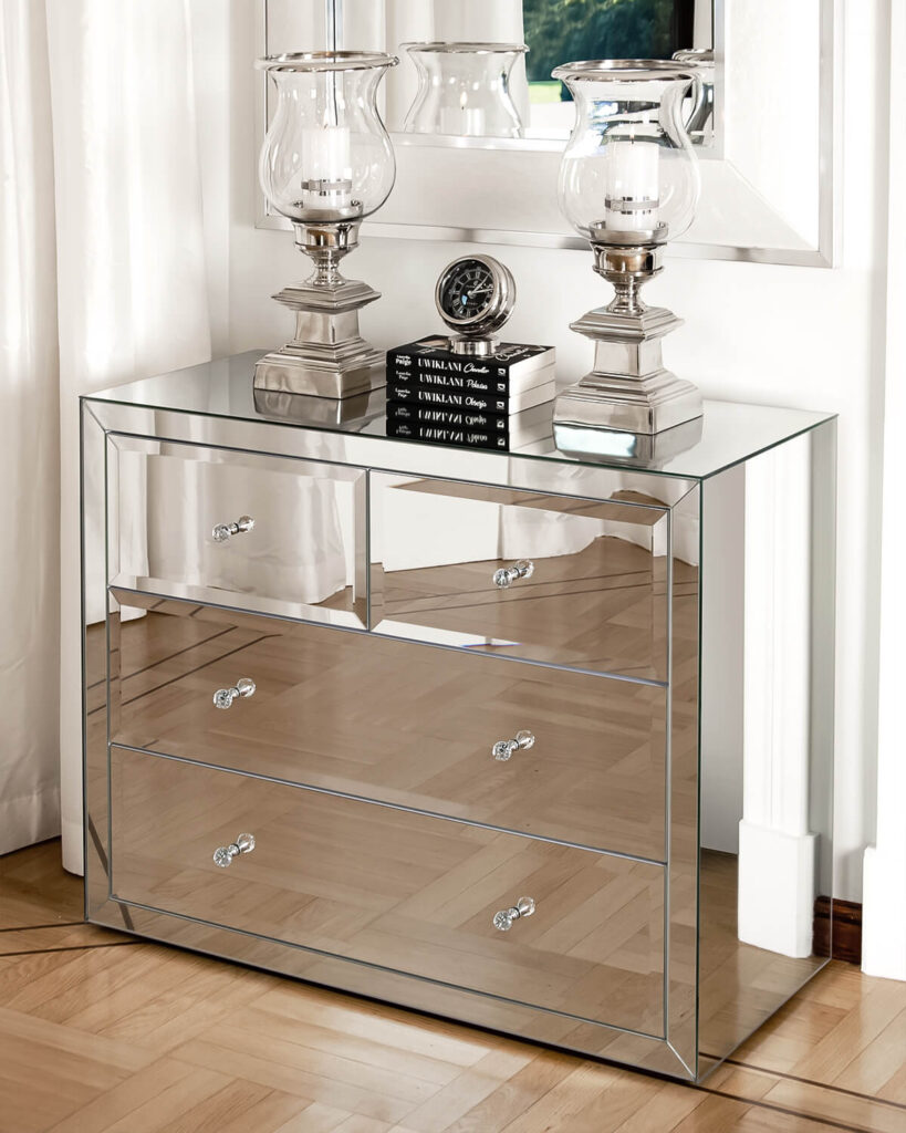 Komoda z kolekcji Greenwich wykonana została z najwyższej jakości lustra kryształowego fazowanego, zaprojektowana w dobrych proporcjach, bez żadnych dodatkowych zdobień. Celowo zaplanowany element konstrukcyjny – rama lustrzana wokół komody – ma podkreślać walory estetyczne tego wyrobu. Układ szuflad z lustra kryształowego fazowanego jest poziomy, co stanowi mocny akcent mebla. Szuflady są głębokie i bardzo pojemne, co niewątpliwe jest atutem komody, która spełni swoją funkcję nie tylko wizualnie, ale również użytkowo.
