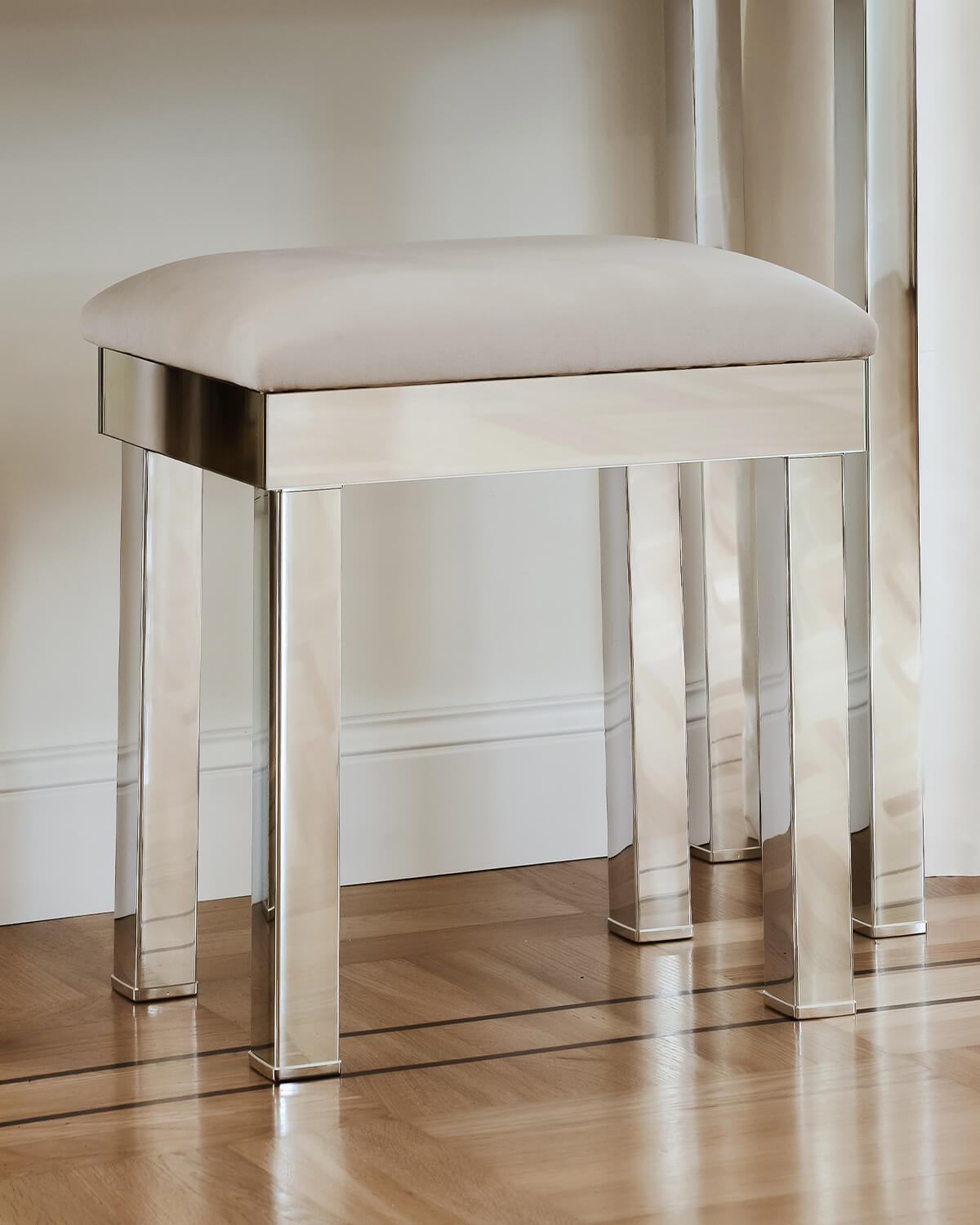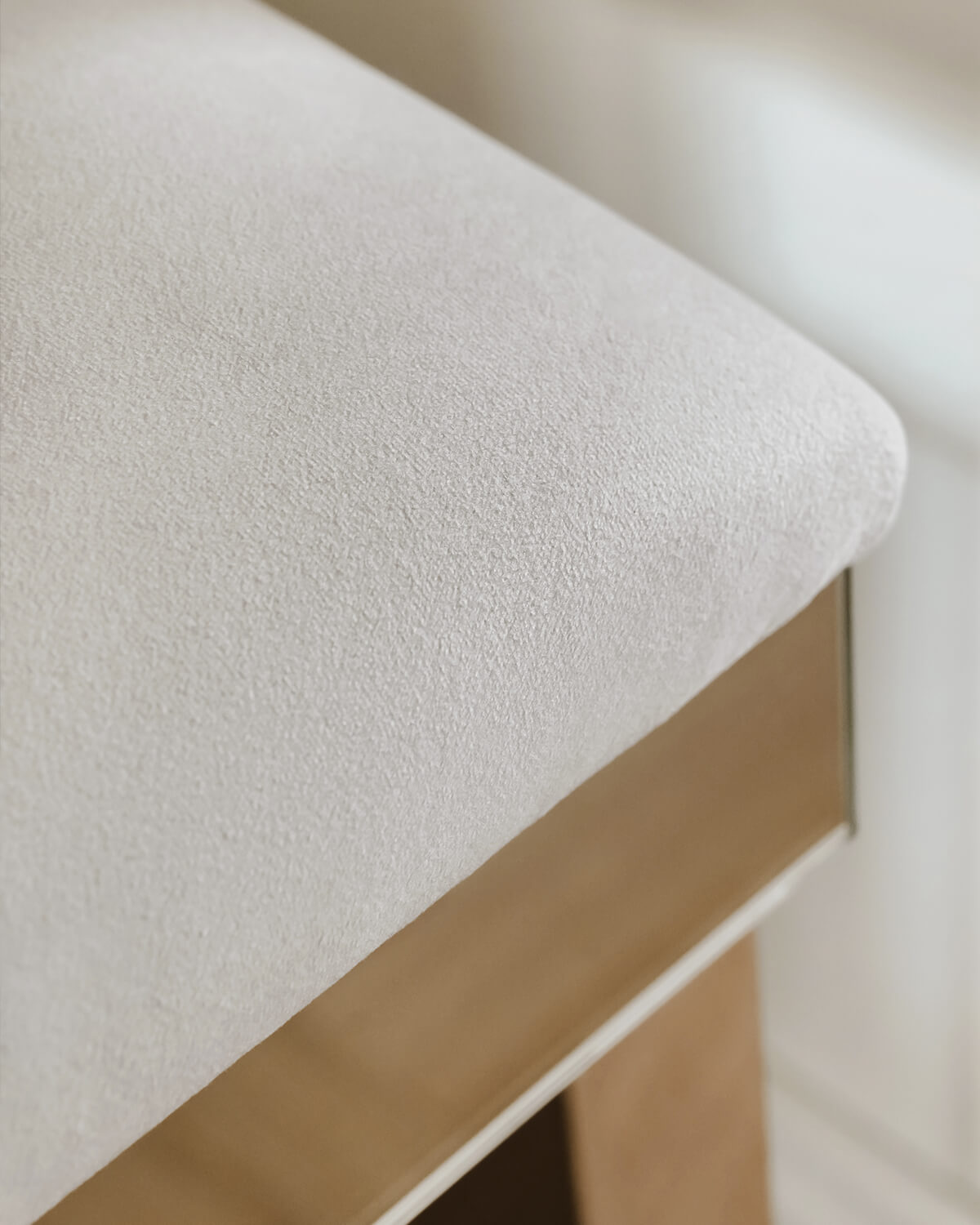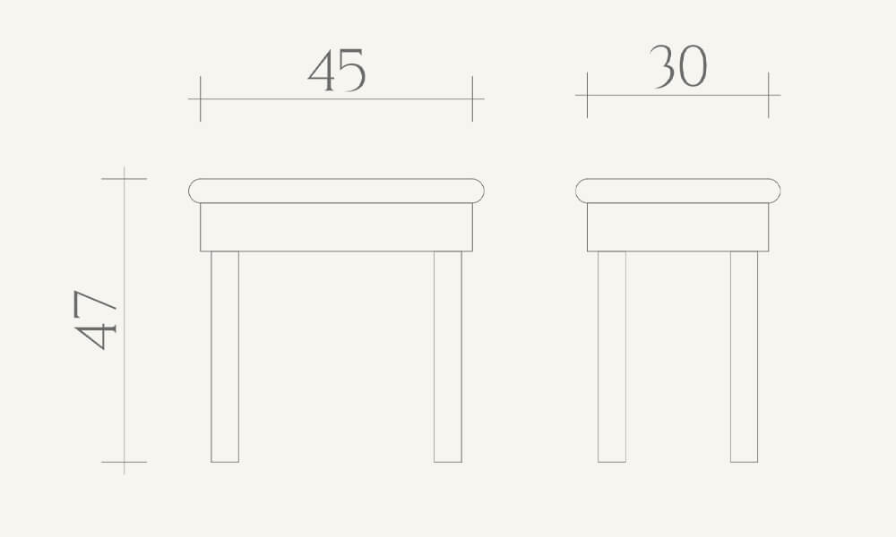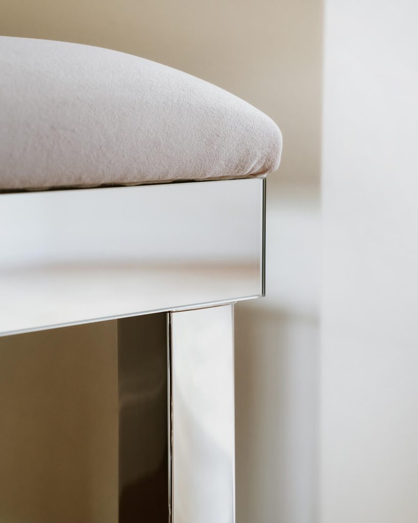 Rama siedziska jest lustrzana, osadzona na czterech nogach wykonanych z profilu 4,5 cm x 4,5 cm pokrytego chromem, tak jak w przypadku toaletki z kolekcji Brooklyn. Głębokość siedziska jest taka sama jak toaletki: 30 cm, co jest atutem tego mebla, ponieważ może zostać on wsunięty pod toaletkę i zupełnie nie przeszkadzać w pomieszczeniu. Możliwość wyboru koloru tkaniny.