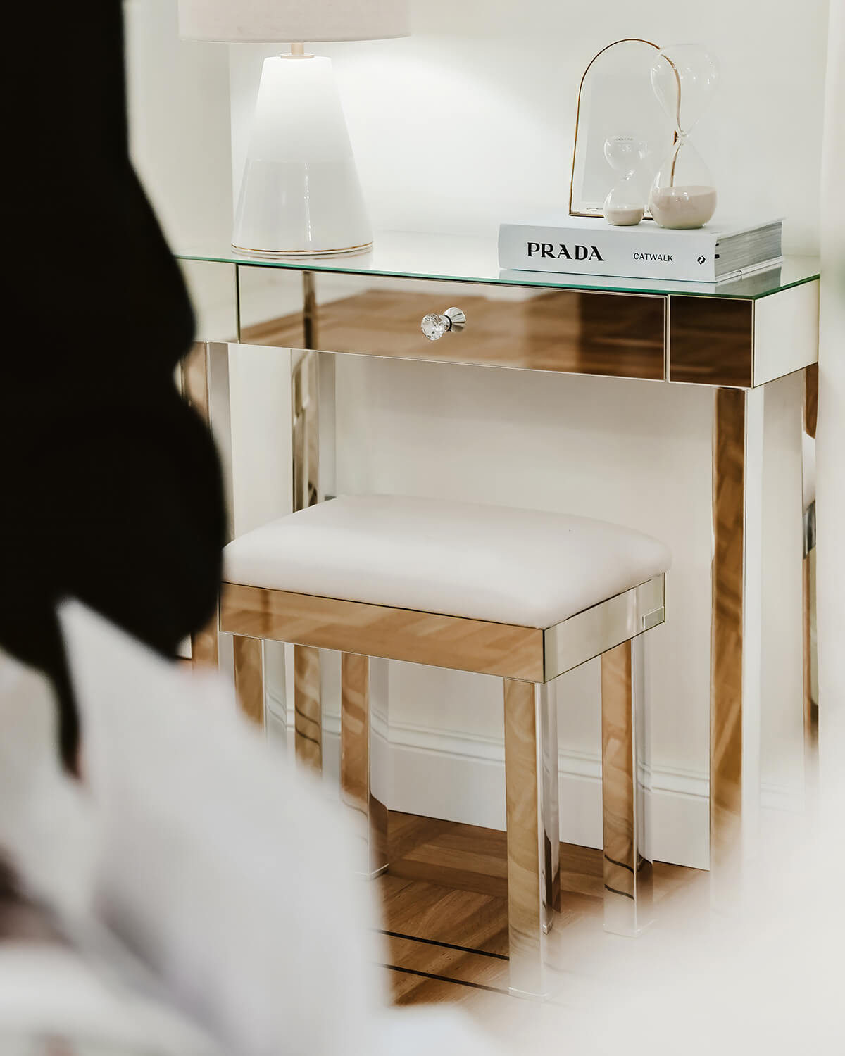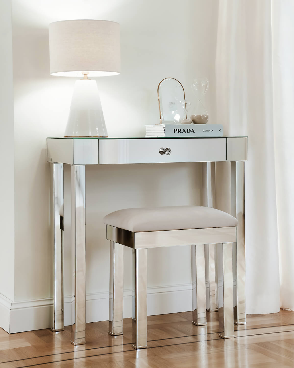 Kolekcja Brooklyn posiada harmonijną, prostą, minimalistyczną konstrukcję solidnego blatu na stelażu chrom. Nowoczesna ze względu na brak zdobień, jedynie kryształową gałką przy szufladach nawiązuje do tradycji rżniętego szkła, a lustrzane powierzchnie nadają stylu glamour. Największą zaletą kolekcji jest jej wszechstronność.